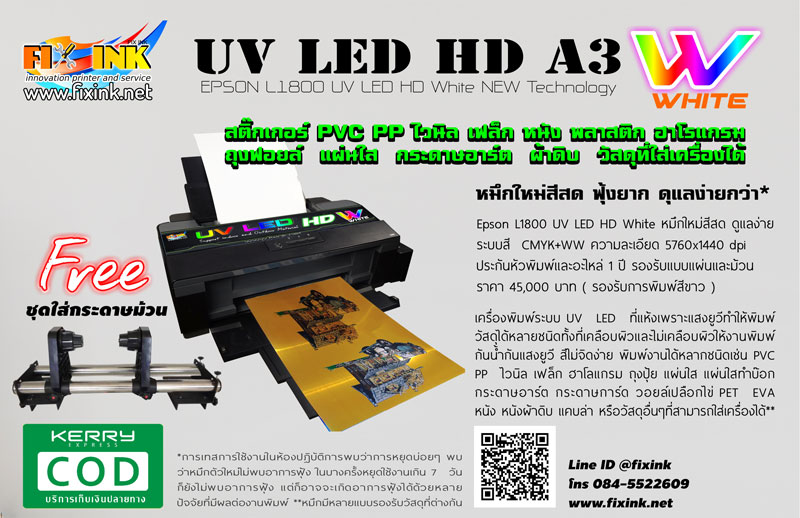 UV LED HD A3 เครื่องพิมพ์ยูวีขนาดเล็กที่ดัดแปลงจากเครื่องพิมพ์ขนาดเล็ก Epson L1300 และ L1800 ดัดแปลงให้รองรับระบบยูวี หมึกยูวีจะแตกต่างจากหมึกชนิดอื่นๆตรงที่จะแห้งเพราะแสงยูวีซึ่งหมึกชนิดอื่นๆจะแห้งเพราะอากาศทำให้หมึกยูวีมีลักษณะที่โดดเด่นกว่าหมึกชนิดอื่น ตรงที่จะพิมพ์ได้คมกว่าเพราะเมื่อหมึกพ่นออกมาก็จะแห้งทันทีและด้วยคุณสมบัติของหมึกที่แห้งเพราะแสงจึงทำให้พิมพ์ได้ทั้งวัสดุที่เคลือบผิวและไม่เคลือบผิว พิมพ์ได้แม้วัสดุที่ไมได้ทำมาเพื่อพิมพ์ เช่นแผ่นใส หนัง ผ้าดิบที่ไม่ให้ตัว โฮโลแกรม หรือแม้แต่วัสดุที่เคลือบผิวมาเพื่อพิมพ์เช่นสติ๊กเกอร์ PVC PP ไวนิล เฟล็ก กระดาษอาร์ต กระดาษคราฟ กระดาษน้ำตาล รับประกันหัวพิมพ์และอะไหล่ 1 ปี มั่นใจได้ว่าเราดูแลหลังการขายได้ชัวร์เพราะเราแปลงเครื่องเองทั้งหมด 100% และด้วยหมึกใหม่ล่าสุดแก้ปัญหาเรื่องฟุ้งและอุดตัน พร้อมด้วยทีมงานดูแลตอบคำถามตลอดเวลา ประสบการณ์เกี่ยวกับเครื่องพิมพ์มากกว่า 18 ปี เต็ม ไม่ต้องรอคำตอบเมื่อเกิดปัญหา