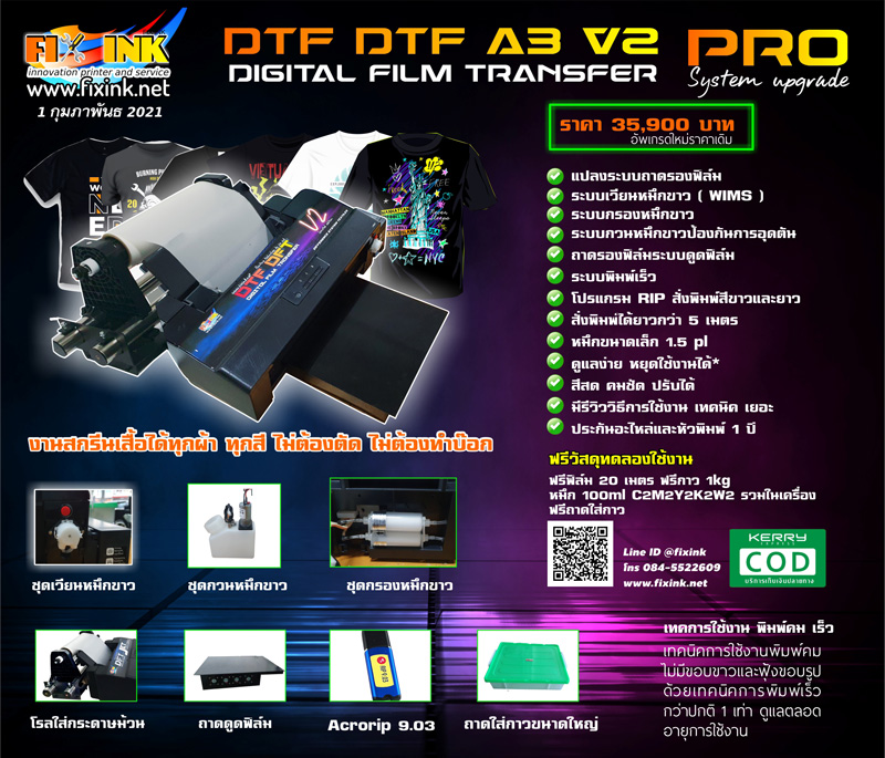 DTF DFT A3 PRO V2 เครื่องสกรีนเสื้อได้ทุกชนิดผ้า ทุกสี ไม่ต้องตัด ไม่ต้องทำบ๊อก รุ่นอัพเกรดใหม่ล่าสุดแต่ราคาเดิม มาพร้อมกับระบบเวียน WIMS หมึกในระบบในสายกลับมายังชุดแท้งค์และดึงหมึกใหม่เข้าไปในระบบ ระบบกวนหมึกขาวไม่ให้นอนก้นหรือจับตัวผ่านระบบกรองหมึกช่วยลดการอุดตัน ชุดโรลใส่กระดาษม้วนทำงานได้ต่อเนื่อง ชุดถาดูดฟิล์มลดปัญหาหัวพิมพ์ขูดและชนฟิล์มพร้อมถาดใส่กาวใช้งานง่าย และอีกชุดสำหรับลูกค้าที่ยังไม่มีเครื่องรีดร้อนที่สามารถใช้ได้ทั้งอบและรีดงานเป็นรุ่นที่เราเลือกมาแล้วว่าเหมาะกับงาน DFT DTF ด้วยหยดหมึกที่มีขนาดเล็กเพียง 1.5 พิโคลิตรทำให้งานเนียนไม่อุดตัน สามารถปรับสีให้เข้มสุด คมชัดได้ตามต้องการรวมถึงความหนาของงาน ออฟชั่นครบจบในชุดเดียวพร้อมเสริมธุรกิจเดิมหรือเปิดร้านใหม่ จัดส่งพร้อมสอนการใช้งานฟรี ทั่วไทย