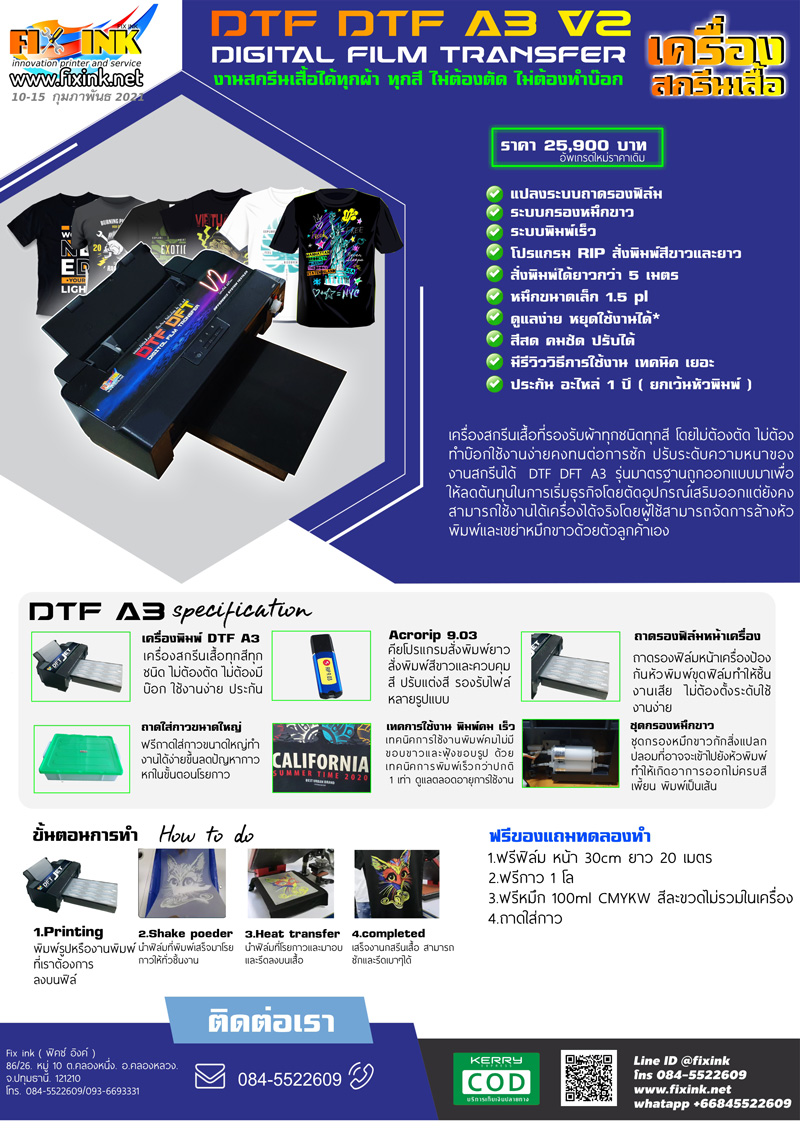 DFT DTF A3 PRO V2 เครื่องสกรีนเสื้อได้ทุกผ้า ทุกสีไม่ต้องทำบ๊อก ไม่ต้องตัด ดูแลง่าย ต้นทุนถูก ประกันหัวพิมพ์และอะไหล่ 1 ปี